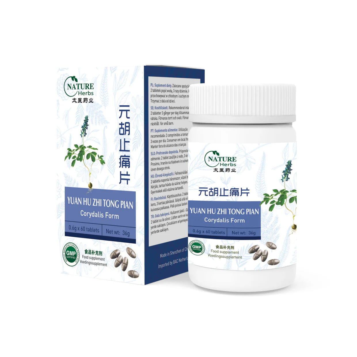 Ingrediënten: Yan Hu Suo (Rhizoma Corydalis) , Bai Zhi (Rx. Angelicae Dahuricae).